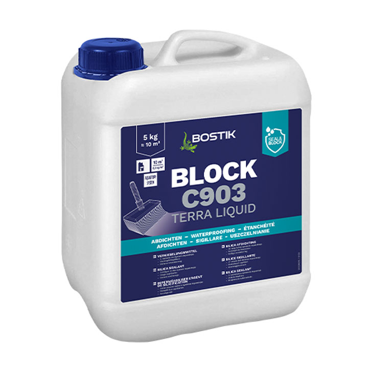 BLOCK C903 TERRA LIQUID jest roztworem na bazie modyfikowanego krzemianu. Nie zawiera rozpuszczalników, a także jest przyjazny dla środowiska naturalnego. Charakteryzuje się niską lepkością oraz wysoką wchłanialnością. Łatwy w aplikacji, termicznie odporny, reaguje z produktami BLOCK C901 TERRA SPECIAL i BLOCK C902 TERRA XPRESS tworząc wraz z nimi specjalny system hydroizolacji Aquastopp. Odporny na mróz i sól drogową.