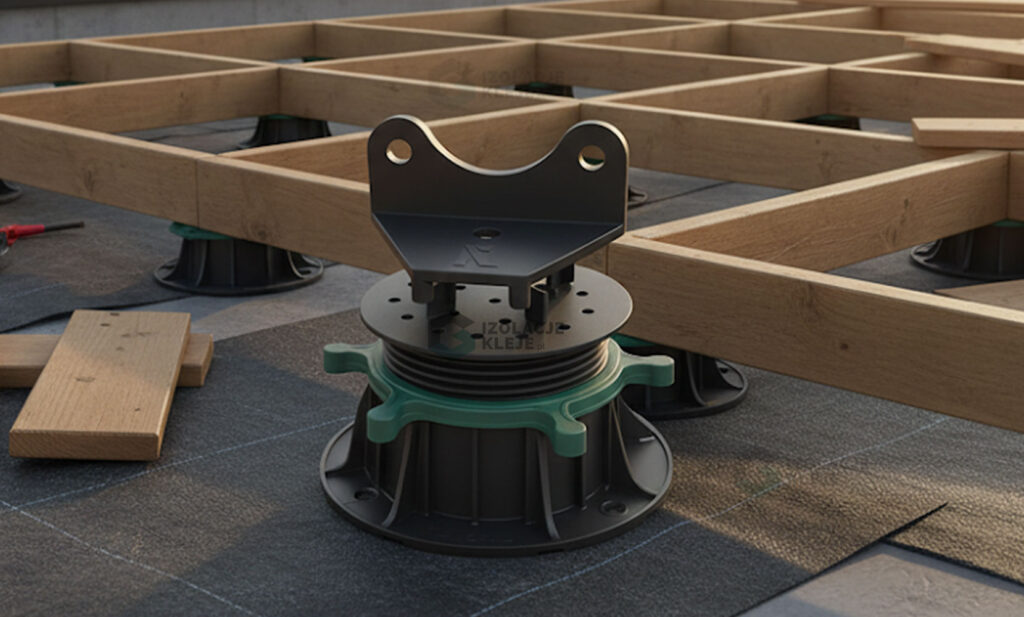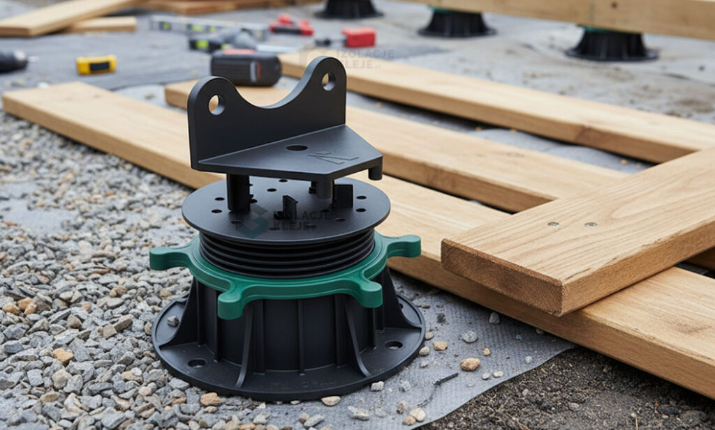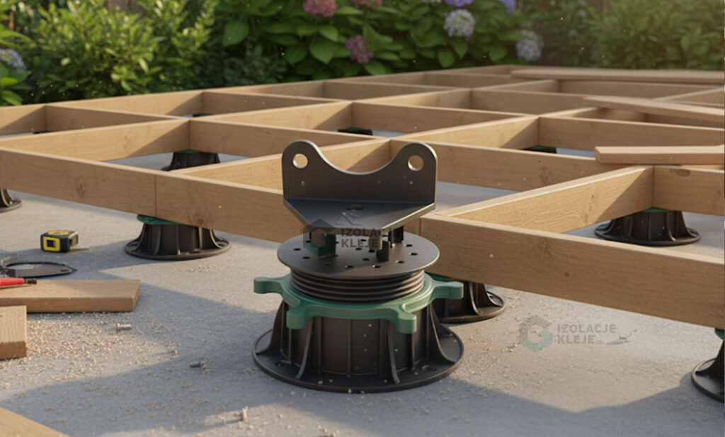 Nakładka separuje legar od twardych elementów konstrukcji, co zmniejsza ryzyko miejscowych naprężeń i powstawania punktowych odgnieceń. Dzięki temu układ nośny pracuje równomiernie, a deski zachowują stabilne podparcie, co przekłada się na dłuższą żywotność i estetykę wykończenia.