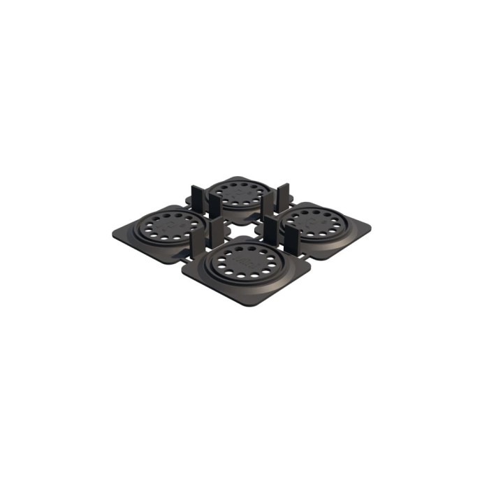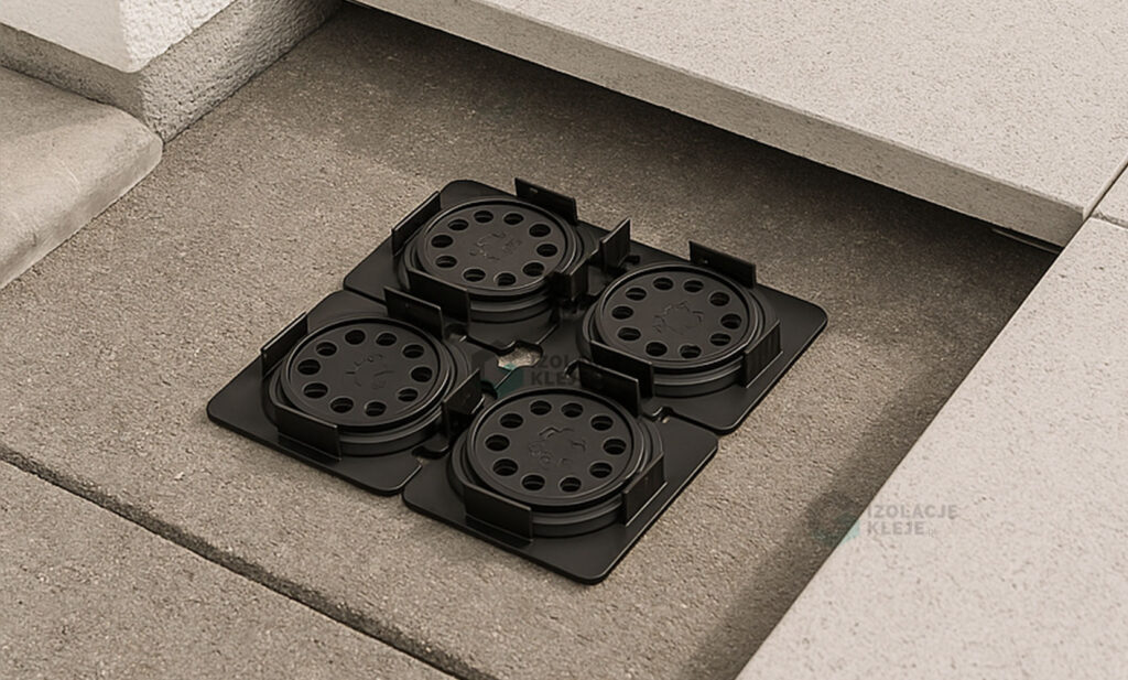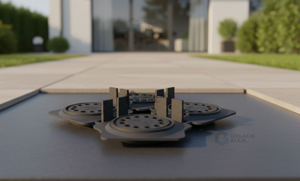 Zintegrowane dystanse o szerokości 2 mm dbają o równy rys fug i prawidłowy odpływ wody, a modułowa konstrukcja umożliwia podział wspornika na dwie lub cztery części. Dzięki temu bez trudu dopasujesz układ podparć do krawędzi, narożników i miejsc przycięć płyt, zachowując stabilność i estetykę całej nawierzchni.