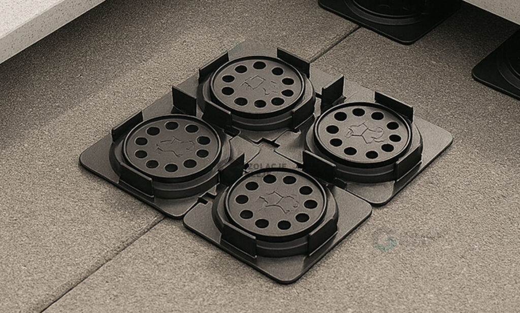 System pozwala na precyzyjne poziomowanie bez ingerencji w podłoże. Wykorzystując nakładki dystansowe w grubościach 0,5 mm, 1 mm, 2 mm oraz 3 mm, łatwo skorygujesz lokalne różnice wysokości i uzyskasz pożądany poziom. Gdy wymagana jest większa wysokość konstrukcji, wsporniki można bezpiecznie piętrować, utrzymując pełną funkcjonalność i stabilność posadzki.