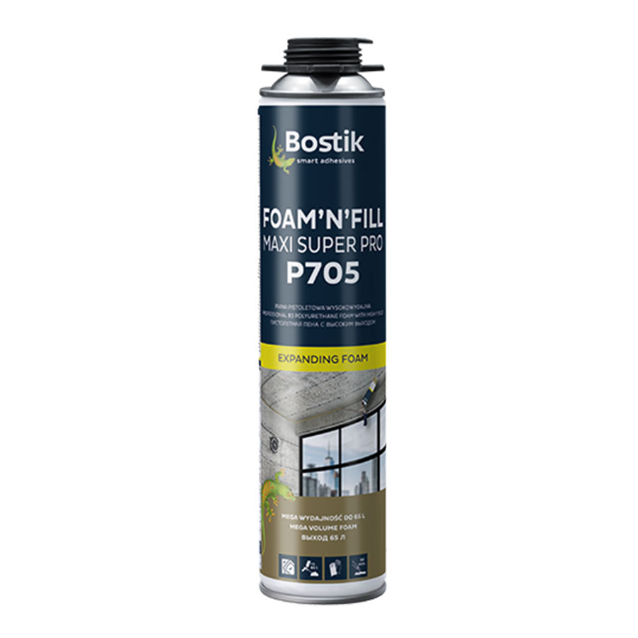 FOAM’N’FILL MAXI SUPER PRO P705 to jednoskładnikowa, wysokowydajna poliuretanowa piana pistoletowa niskoprężna, do zastosowań montażowych, izolacyjnych i uszczelniających. Piana wiąże pod wpływem reakcji chemicznej z wilgocią znajdującą się w powietrzu atmosferycznym i materiałach budowlanych.